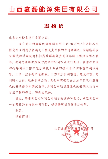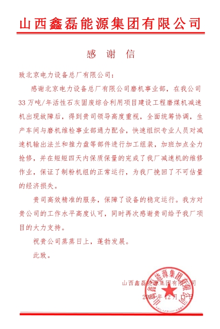 近日,公司磨机事业部收到山西鑫磊能源集团感谢信,感谢公司磨机事业部在磨煤机减速机出现故障后的全面统筹协调,短时间迅速解决问题,保障了设备的稳定运行。
