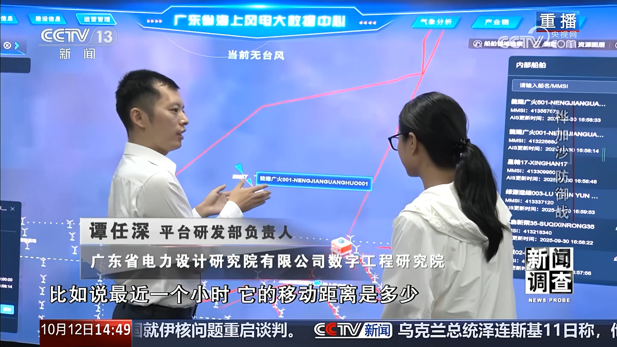 广东省电力设计研究院有限公司数字工程研究院设计总工程师谭任深:所有船的位置都在这个平台上面,您可以看到这里面很多绿色的一些形状,就是三角形,这其实每个三角形就是一条船。它的位置我们实时看到,比如说最近一个小时它的移动距离是多少,然后我们现在通过这个技术手段,我们可以去监测米级的移动。